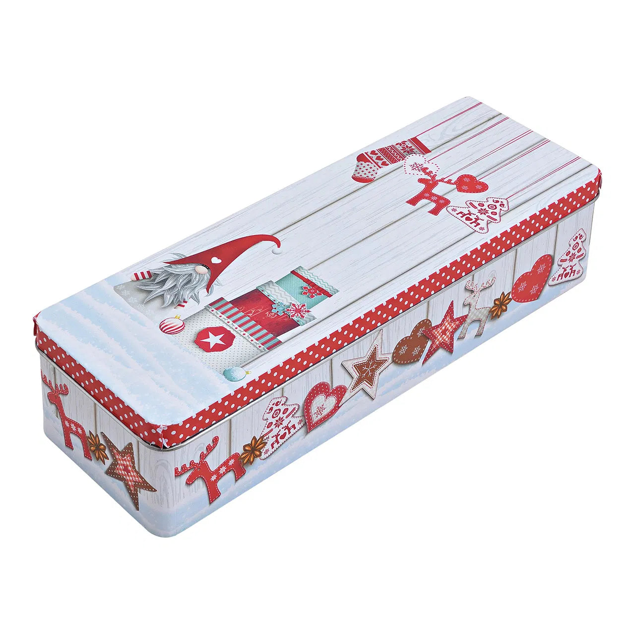 Boîte en métal décorée de lutins et de motifs de Noël