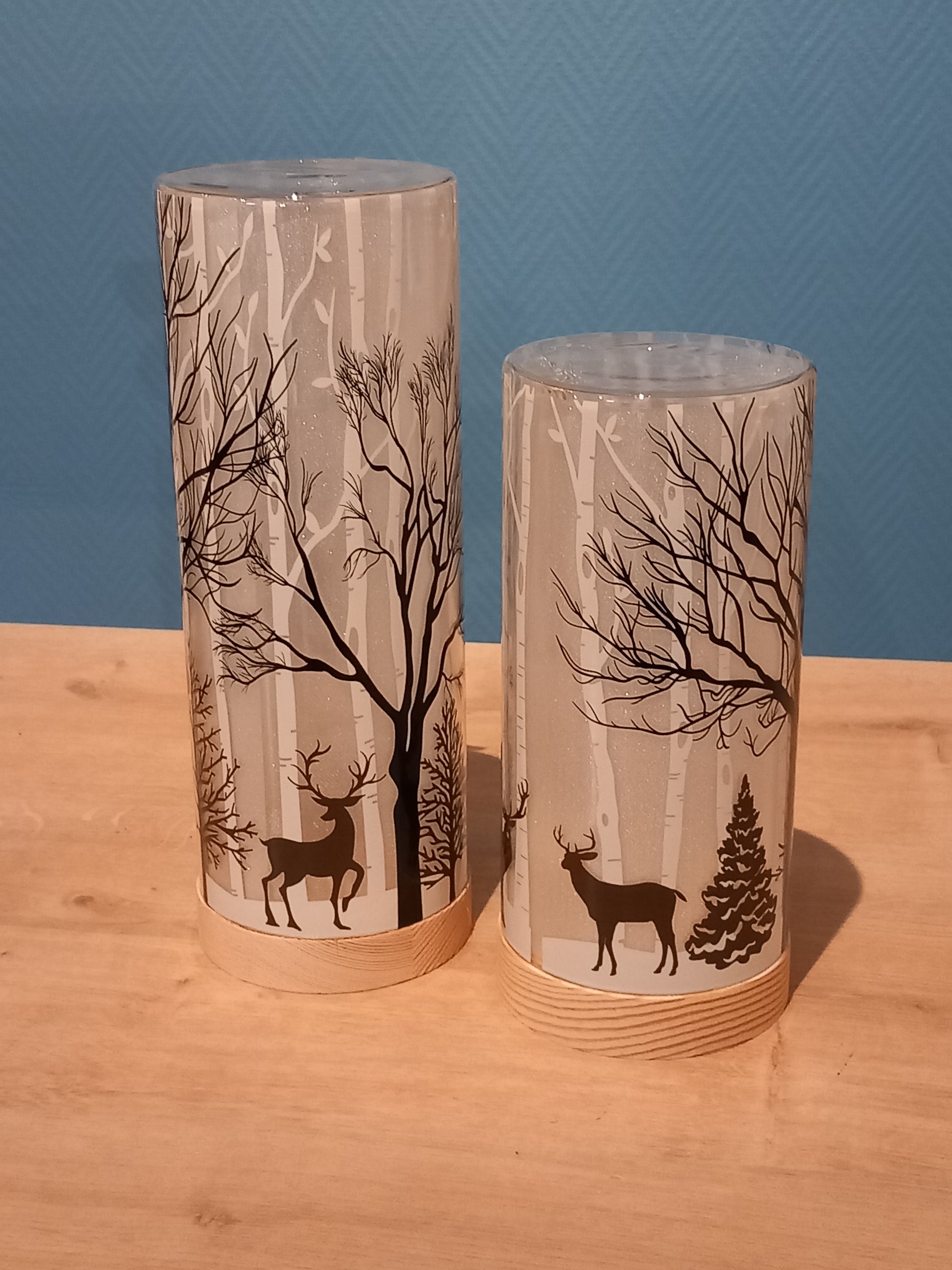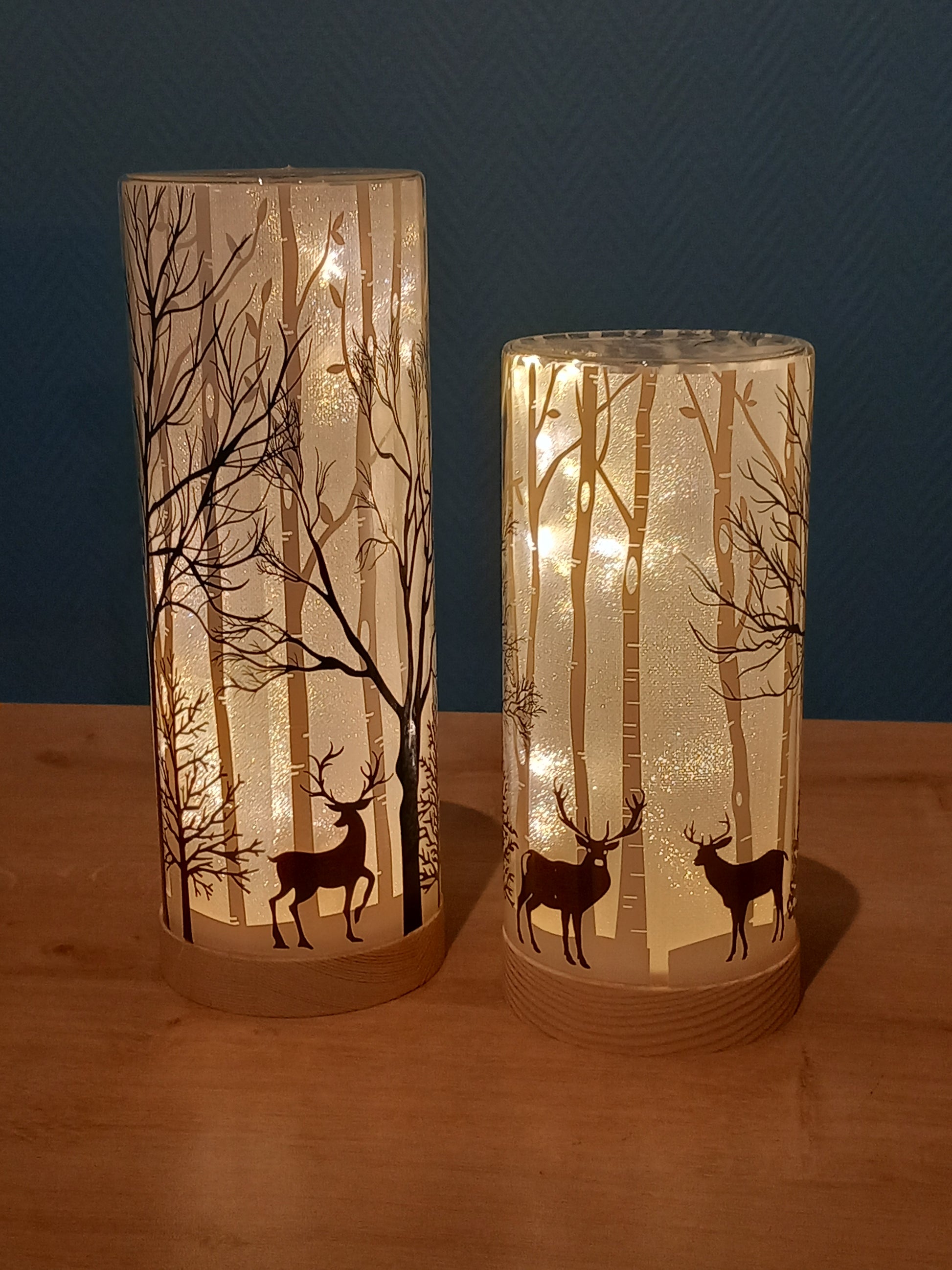Photophore en verre sur base en bois avec une guirlande LED à l'intérieur